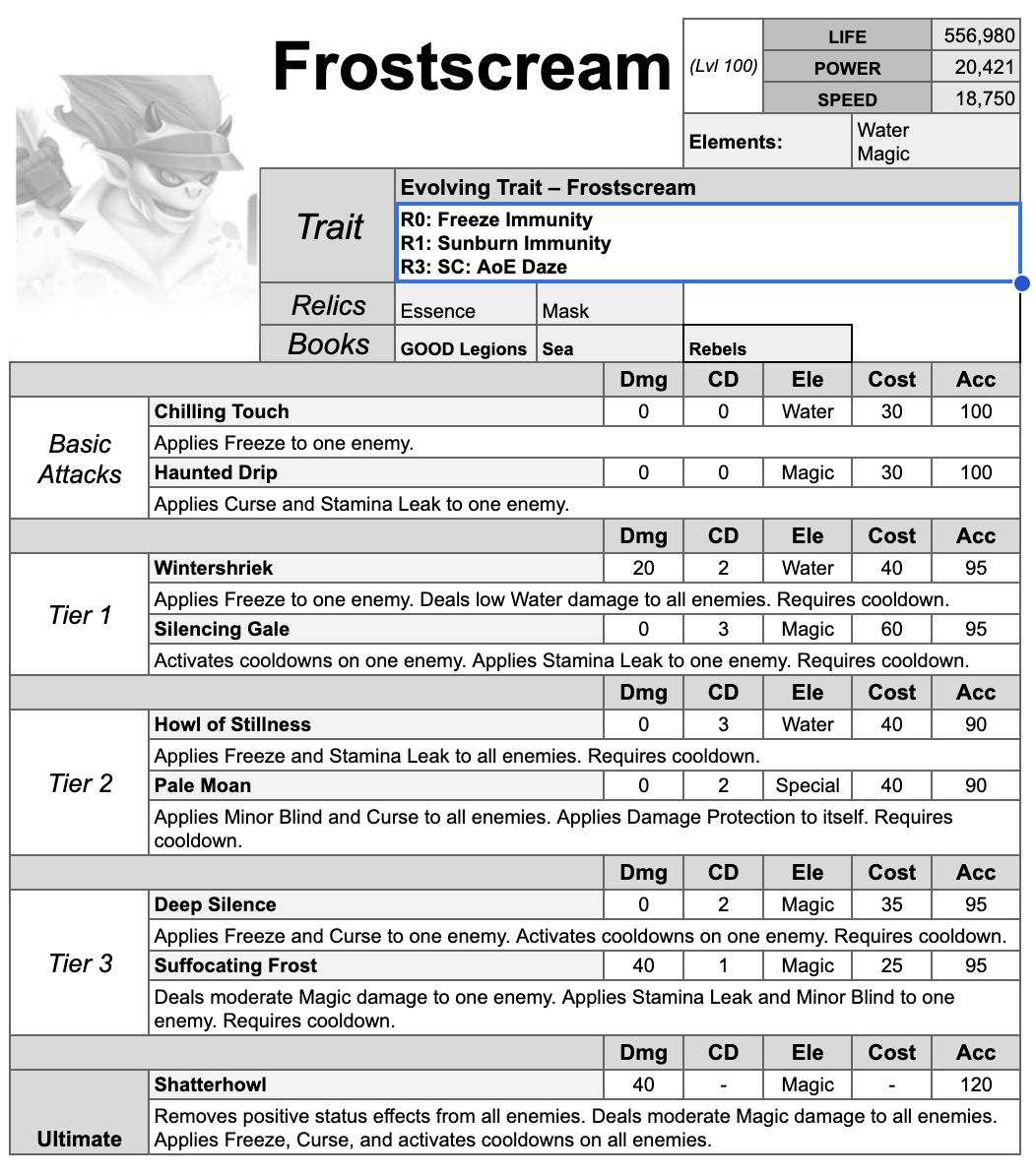 And yet, Frostscream’s wrath is not born of hatred, but memory. He howls not to destroy, but to remind the world of the betrayal carved into his soul. Those who hear his voice feel more than cold—they feel the sting of trust broken, the ache of love turned to treachery. To the GOOD Legions, the Sea wanderers, and the Rebels, Frostscream is a tragic figure: a guardian turned tormentor, cursed to seek justice not with vengeance, but with sorrow that will never thaw.