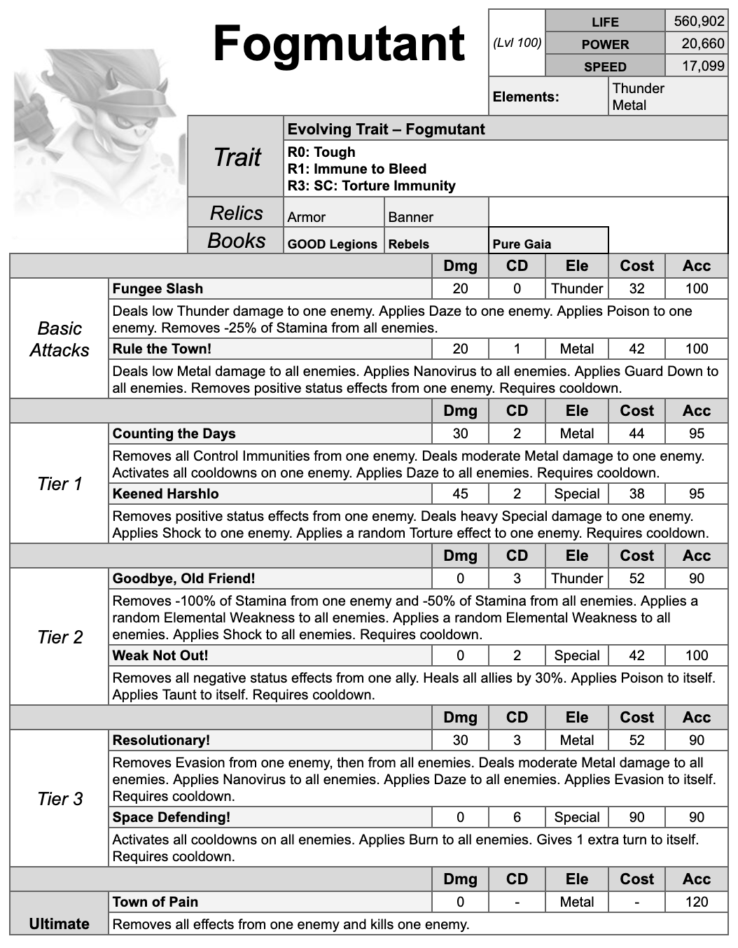 Fogmutant is a Thunder and Metal Control monster who can drain stamina, activate cooldowns, and spread Nanovirus while cleansing and healing allies.
