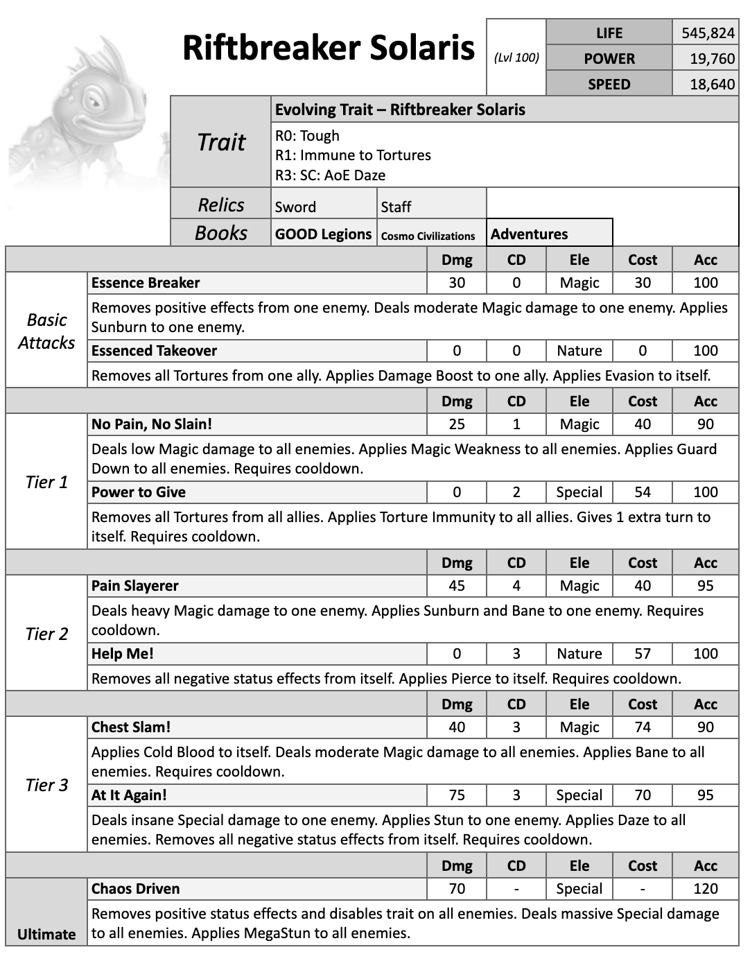 Riftbreaker Solaris is a Magic and Nature Attacker with Support gimmicks with access to NER, Torture Removal, Pierce, and Evasion.