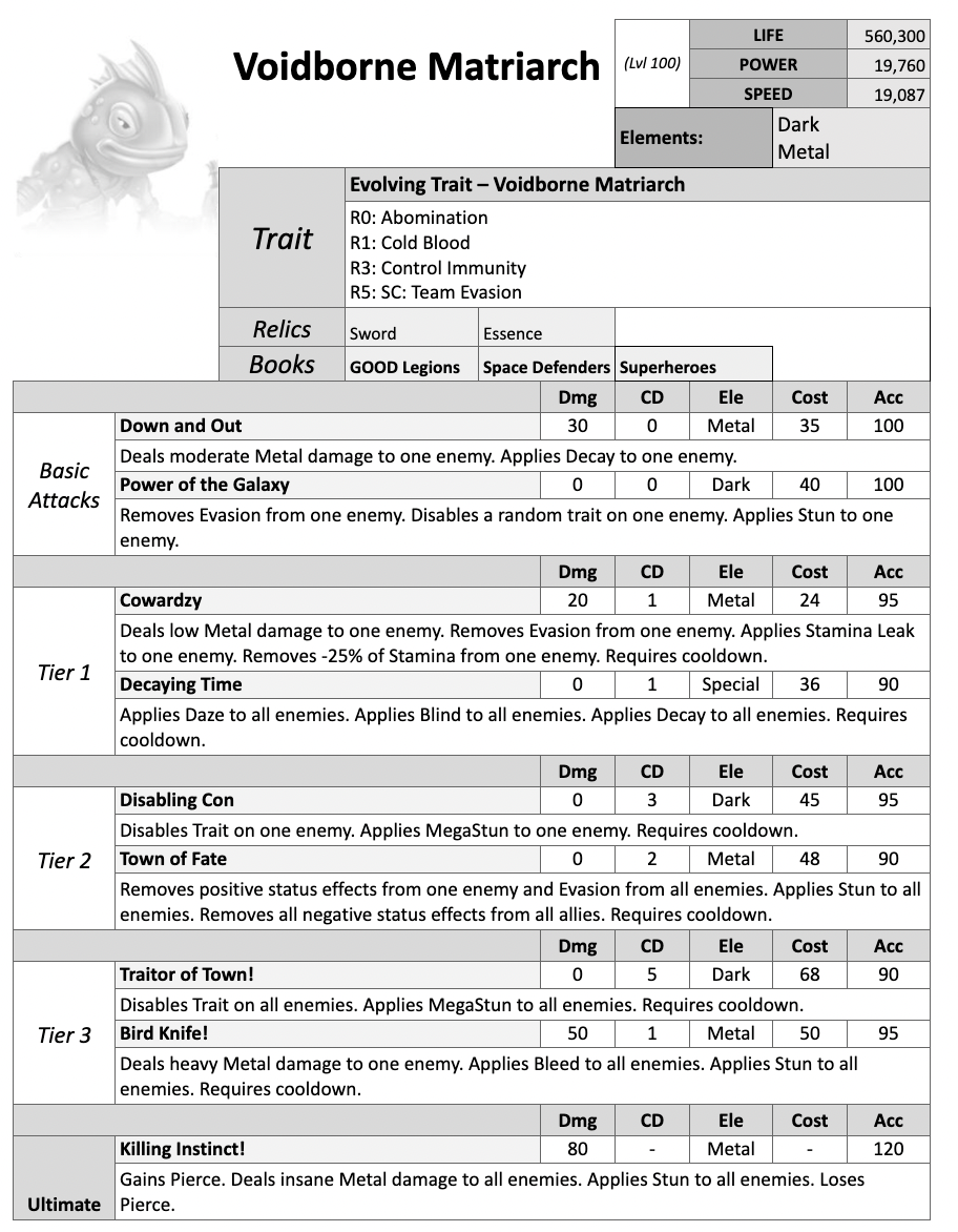 Long before the current eras of the Monster World, there were beings that did not evolve from elements, magic, or nature at all — they arrived. The Voidborne Matriarch is one of those entities, a parasitic intelligence born in the space between realities where time has no direction. Despite the title, he is no mother; the name comes from the countless broods he cultivates. He seeds fragments of himself into worlds, patiently raising entire species and civilizations only to reclaim them once they grow powerful enough to be worth consuming. Entire kingdoms have unknowingly worshipped him as a creator god, never realizing they were simply livestock being fattened for a harvest measured in centuries. Now that dimensional barriers across the Monster World have weakened, the Matriarch no longer needs subtlety — he has manifested physically, and wherever he walks, reality begins to thin, as if existence itself remembers it was never meant to hold him.