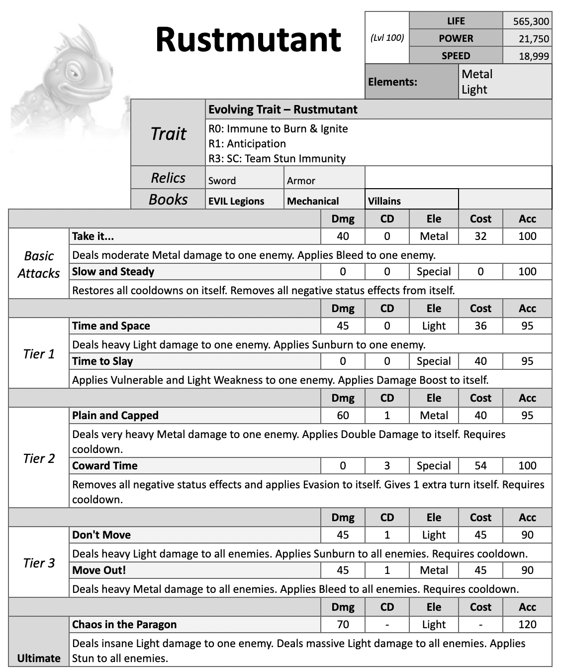Rustmutant is a Metal and Light Attacker with Torture skills and Anticipation as a trait.