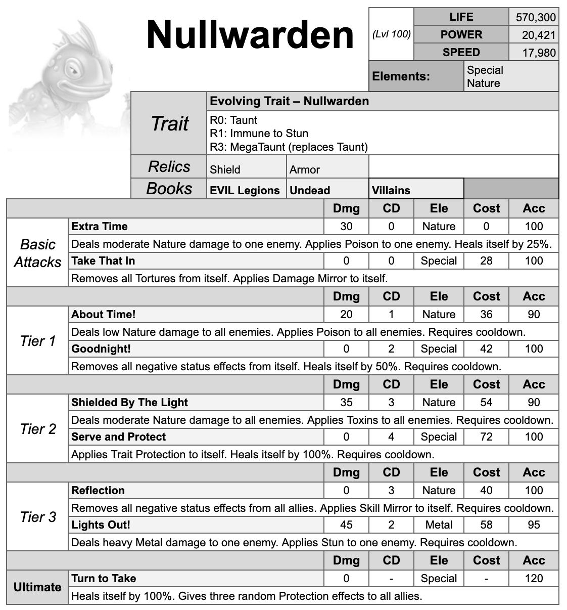 Nullwarden is a Special and Nature Tank with MegaTaunt trait.