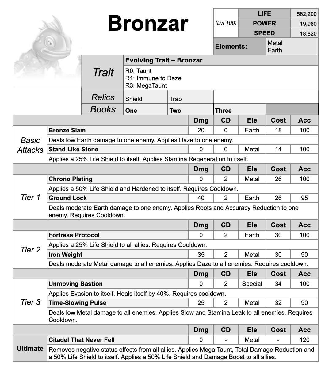 Bronzar is a Metal and Earth Tank with Taunt as a trait.
