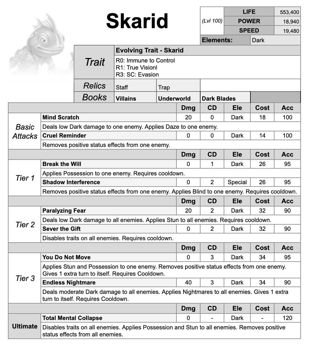 Skarid is a Dark predator born in the caverns beneath the world where light has never reached and sound itself struggles to travel. His body is wrapped in jagged chitin plates that grew around him like armor as he hunted ever larger prey, each crack and scar marking a victory rather than a wound. He does not rely on sight; instead, Skarid senses the heartbeat of living creatures, tracking them through stone and shadow with terrifying precision. Legends say entire tunnel colonies vanished overnight after disturbing his territory, leaving only claw-scored walls and silence behind. Unlike mindless beasts, however, Skarid hunts with intent — he seeks powerful opponents, believing strength is proven only against resistance, and when he emerges from the darkness it means he has chosen a worthy challenge.