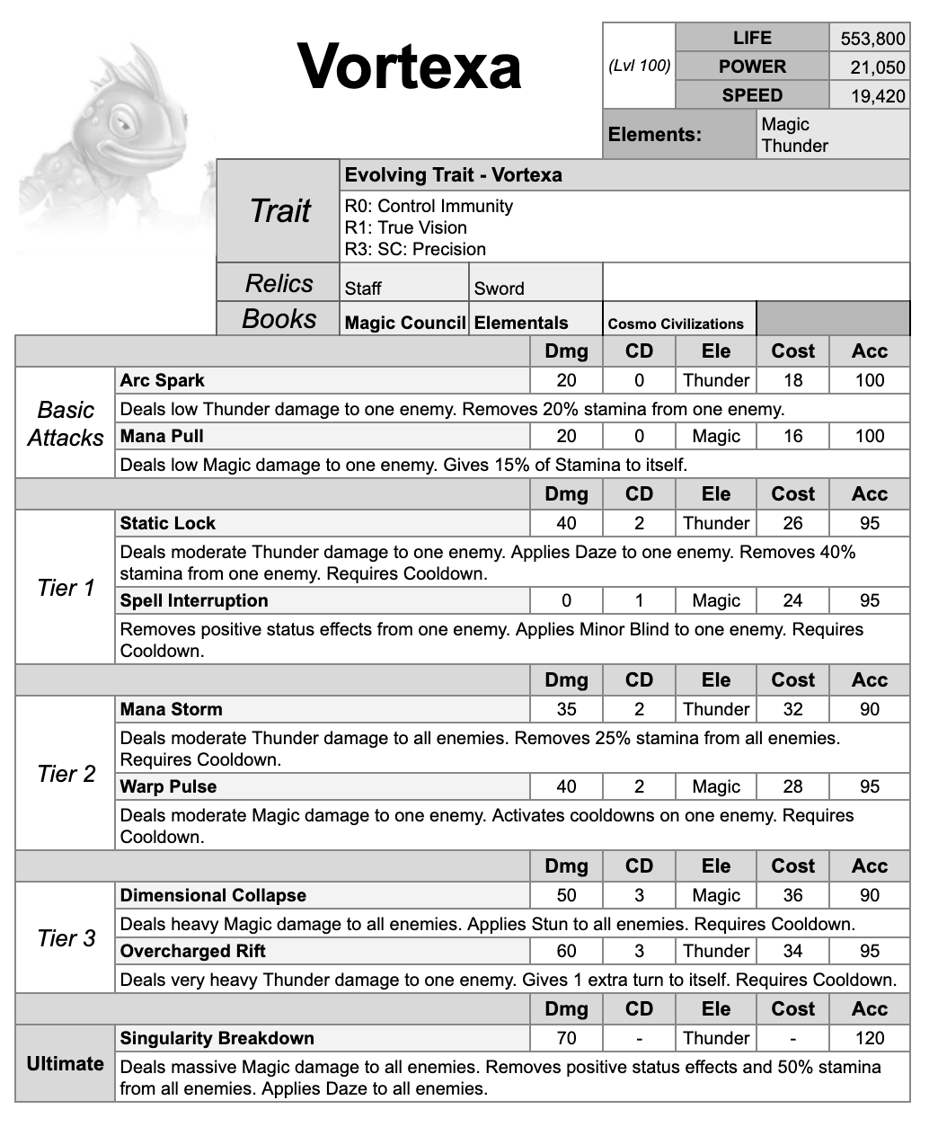 Vortexa is a Magic and Thunder Denier-Attacker hybrid who controls enemies with stamina removal and control effects while chaining extra turns to pressure weakened targets.