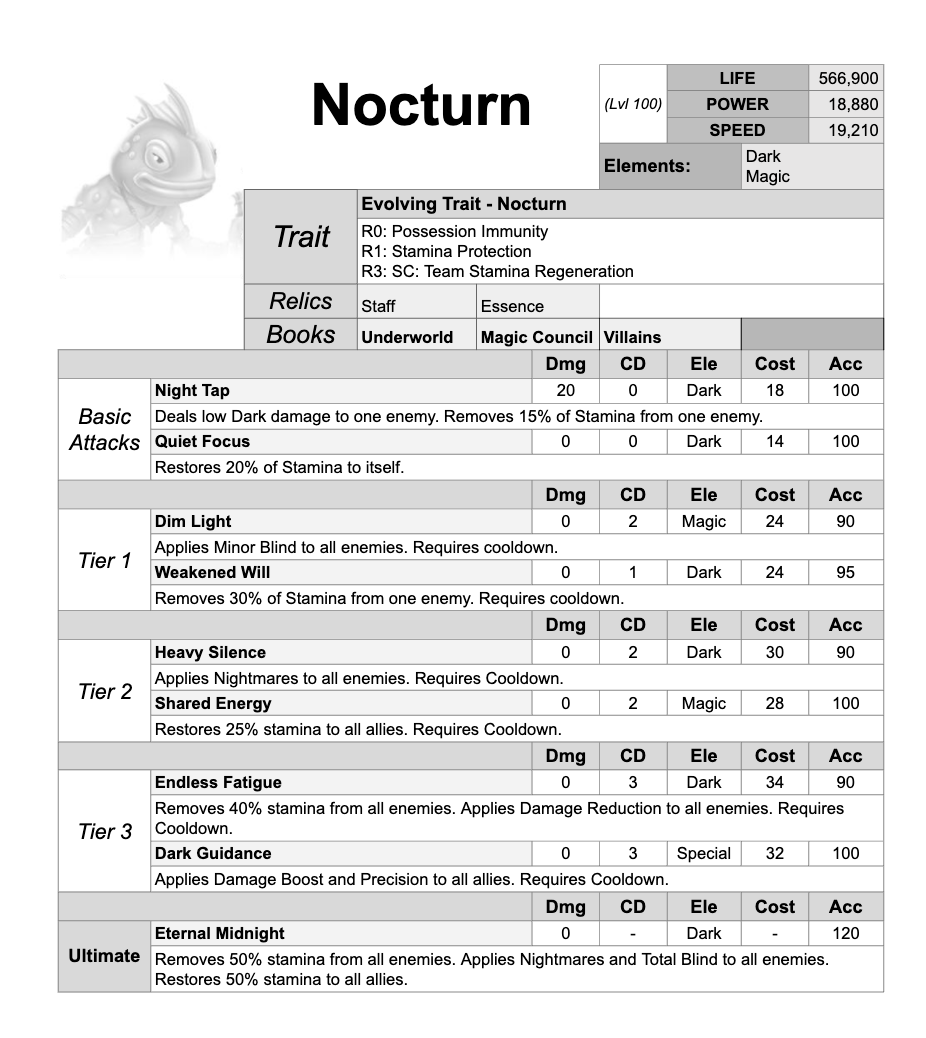 Nocturn is a Dark and Magic Support who drains stamina, weakens damage output, and repeatedly disrupts enemy turns while slowly empowering his team.