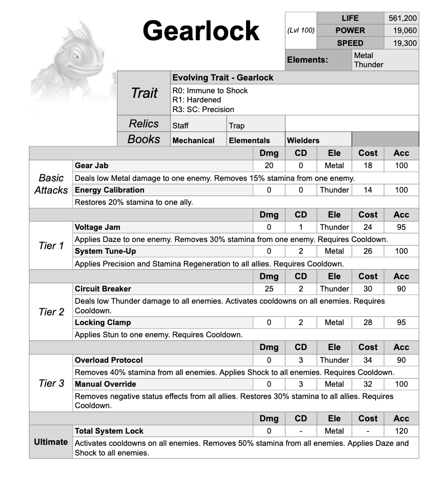 Gearlock is a Metal and Thunder Control Support who locks enemy cooldowns, drains stamina, and restricts skill usage while restoring stamina and precision to allies.