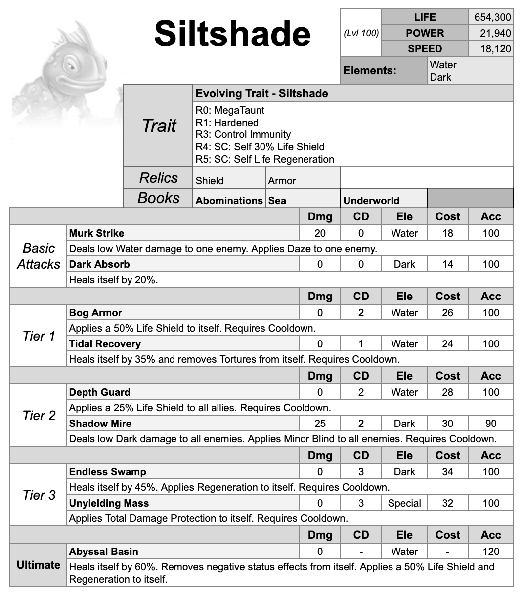 Siltshade is a primordial marsh guardian that rises from black waters when its territory is threatened. Its body absorbs damage endlessly while the mire restores it, making it nearly impossible to bring down through brute force.